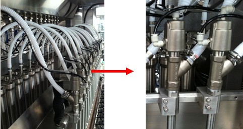 4、氣缸帶動灌裝頭運行的下潛灌裝方式,配合可設(shè)定的變速灌裝功能,可降低易起泡物料在灌裝時泡沫的產(chǎn)生,防止物料外溢造成的瓶口污染。同時將灌裝頭下潛的氣缸動作機構(gòu)移到積液水盤的下方,防止外濺物料對氣缸等零件的腐蝕,目前只有我公司采用這種專li機構(gòu)。