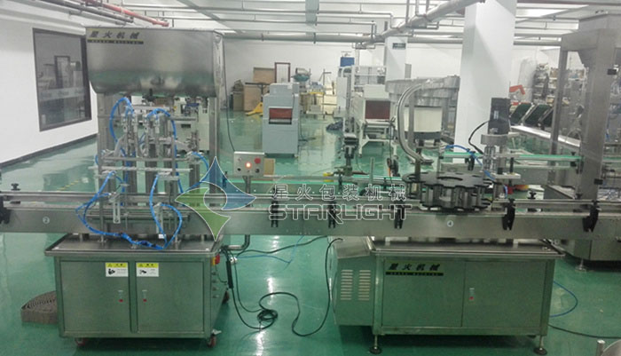 由四頭灌裝機的料桶倒入橄欖油,該機完成四頭同時瓶的灌裝,完成后的瓶子進(jìn)入下一工序,由自動旋蓋機對瓶子進(jìn)行上蓋、鎖蓋工作,完成后流入下一工序,由自動圓瓶貼標(biāo)機對瓶子進(jìn)行貼標(biāo),到此整個生產(chǎn)工序完成。