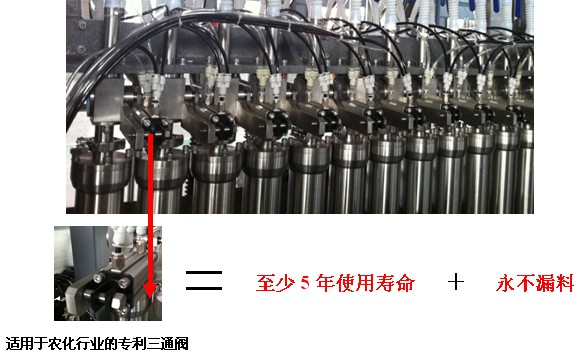 3、根據(jù)高粘度灌裝機5年的研發(fā)經(jīng)驗及市場反饋,我公司自行成功研發(fā)出更適合農(nóng)化行業(yè)的灌裝三通閥。該三通閥結(jié)構(gòu)簡單、性能可靠,很大的優(yōu)點在于使用壽命長,密封可靠,長時間使用后不漏料。目前該三通閥技術(shù)是我公司的特色專li。