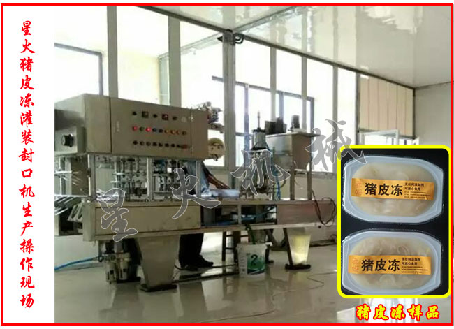 不管是冬季還是夏季,豬皮凍都是市場(chǎng)上非常熱銷(xiāo)的涼菜,人們都非常喜愛(ài)這種便捷的食用食品,也因此豬皮凍的市場(chǎng)很好。自打豬皮凍熱銷(xiāo)起來(lái),帶動(dòng)了相關(guān)產(chǎn)業(yè)的發(fā)展,豬皮凍的加工以及在市場(chǎng)上的銷(xiāo)售是離不開(kāi)灌裝封口機(jī)的。今天星火封口機(jī)公司為大家介紹一款專(zhuān)門(mén)適合盒裝豬皮凍生產(chǎn)的豬皮凍灌裝封口機(jī),豬皮凍灌裝封口機(jī)適用于各種豬皮凍、八寶粥、綠豆沙等產(chǎn)品的盒裝、碗裝、杯裝生產(chǎn),能自動(dòng)完成塑料盒/碗/杯的自動(dòng)落盒/碗/杯、充填米、充填蓮子等、水灌裝、紫外線消菌、光電定位、兩道熱封、自動(dòng)對(duì)芯剪切及廢膜回收等功能。